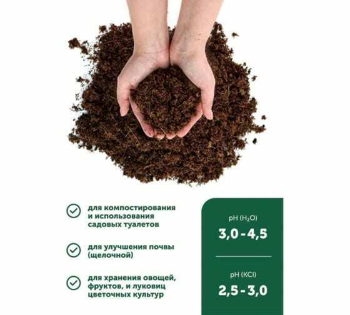 Назначение: - предназначен для выращивания и посадки хвойников, рододендронов, вересковых (клюква, брусника), гортензий, азалий, хвойных деревьев. - подходит для выращивания комнатных растений, для мульчирования, для формирования красивых и однородных газонов. - используется в виде комплексной основы для приготовления удобрений. - применяется в качестве укрывного материала в зимний период, как обеззараживающая подстилка для животных и птиц. - почвоулучшитель может использовать для компостирования.